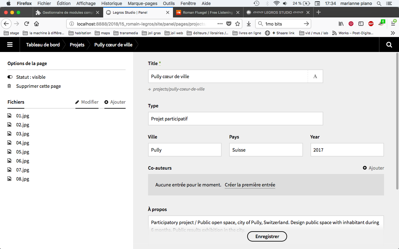 Si tu cliques sur un projet spécifique, tu peux modifier les informations le concernant et ajouter des images. L'ordre des images est également modifiable, simplement en les déplaçant dans la liste.